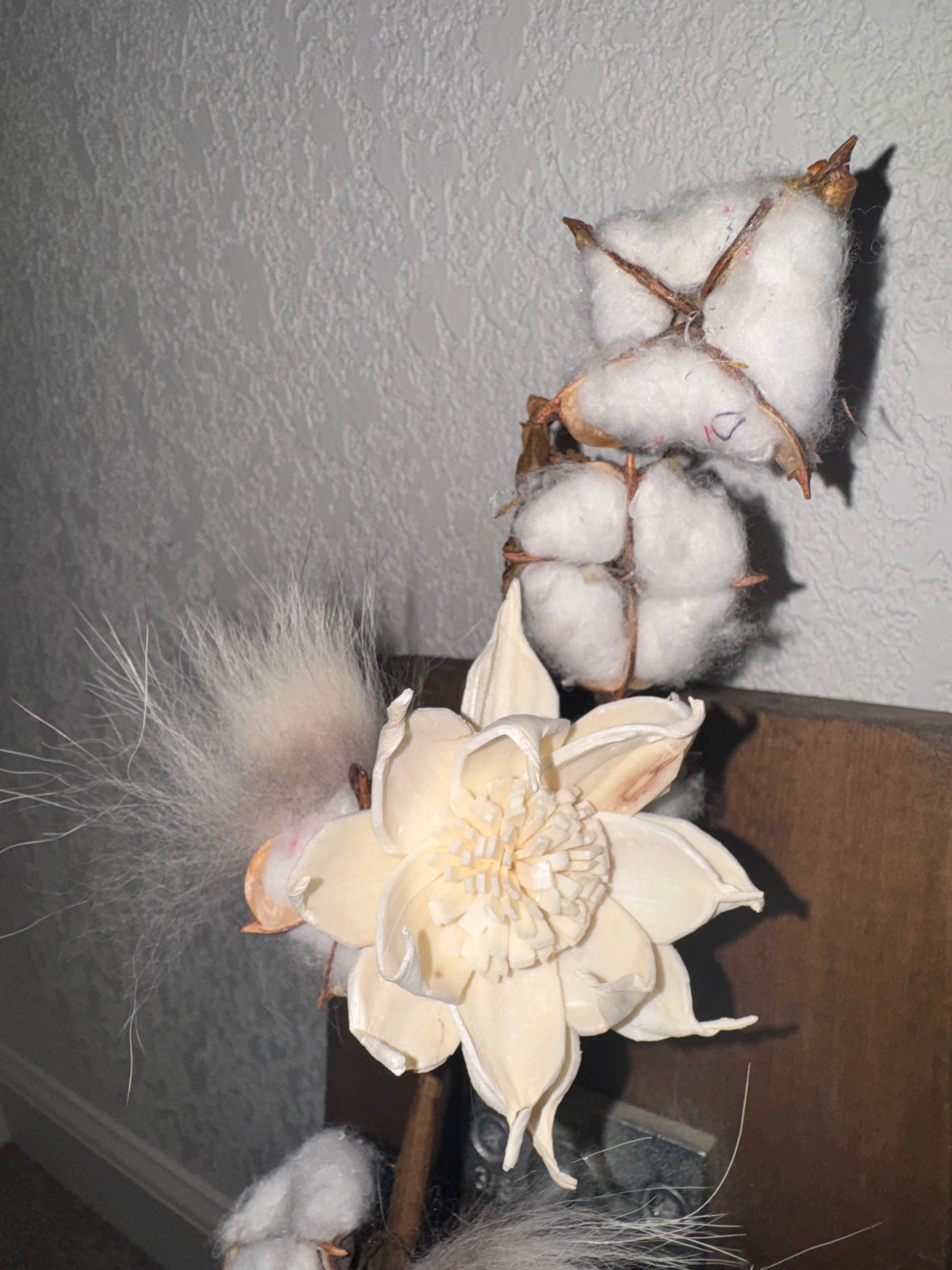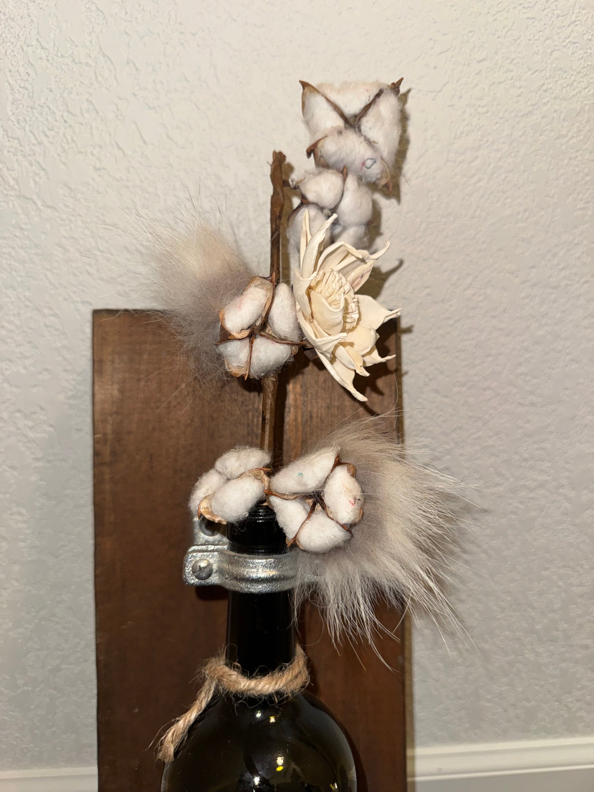 This home decor is made with a rustic wine bottle, sealskin tundra flowers, and jute rope fastened on a heavy wooden piece for hanging.